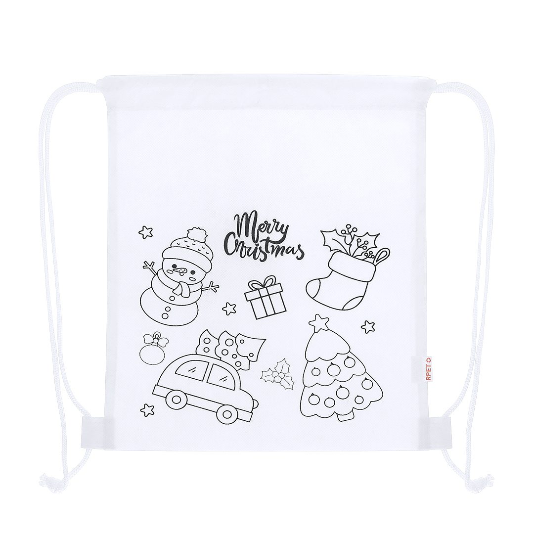Mochila de Natal infantil feita de RPET não tecido, especialmente desenhada para colorir com lápis de cor. Com divertidos desenhos de Natal, incluindo 4 lápis de cor em diferentes cores. Possui cordões de auto-fecho e fechos de tecido, e uma etiqueta RPET do lado de fora.